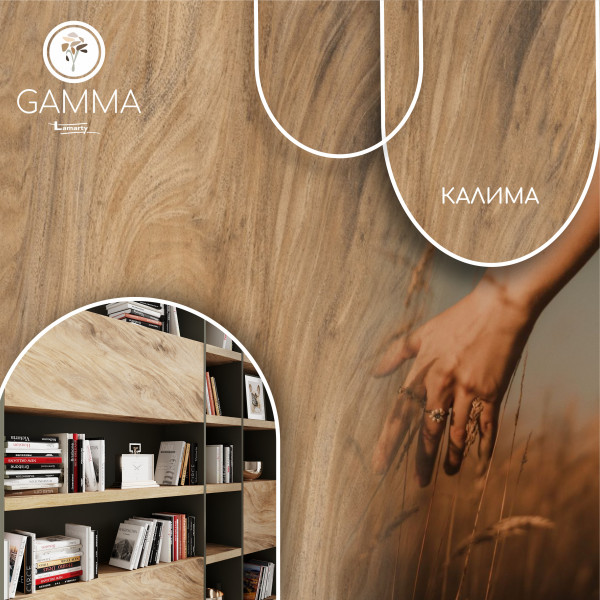 Тёплый оттенок декора КАЛИМА напоминает о золотистом песке или об осенних полях спелой ржи, оживлённых дуновением ветра. Текстура древесины, украшенная рисунком, напоминающим воздушные волны, передаёт ощущение движения и лёгкости, словно ветер ласково, создаёт эти живописные узоры.