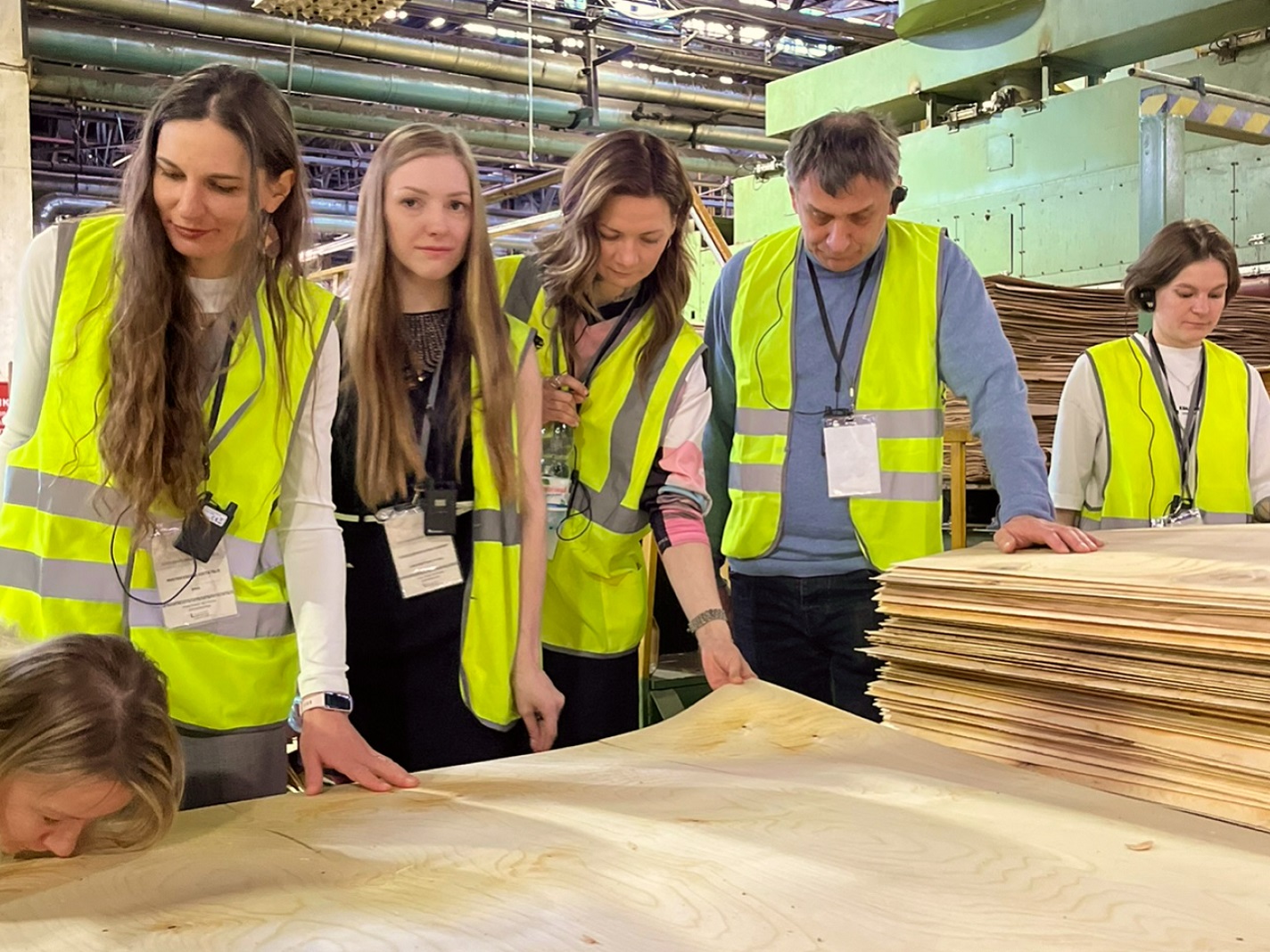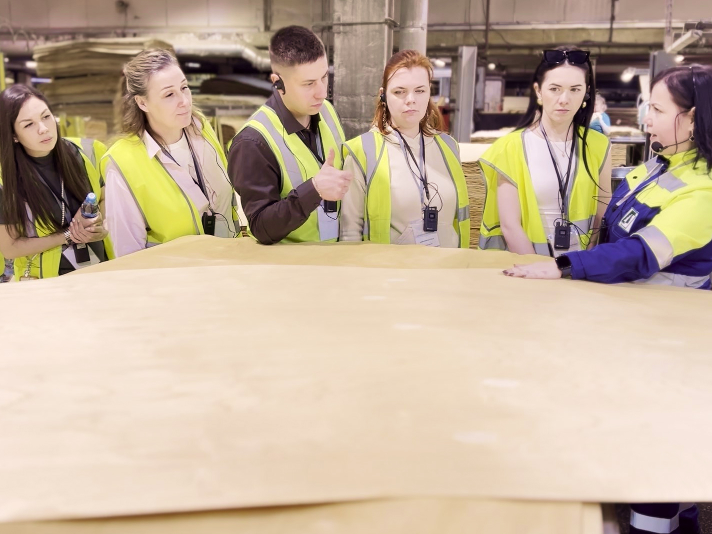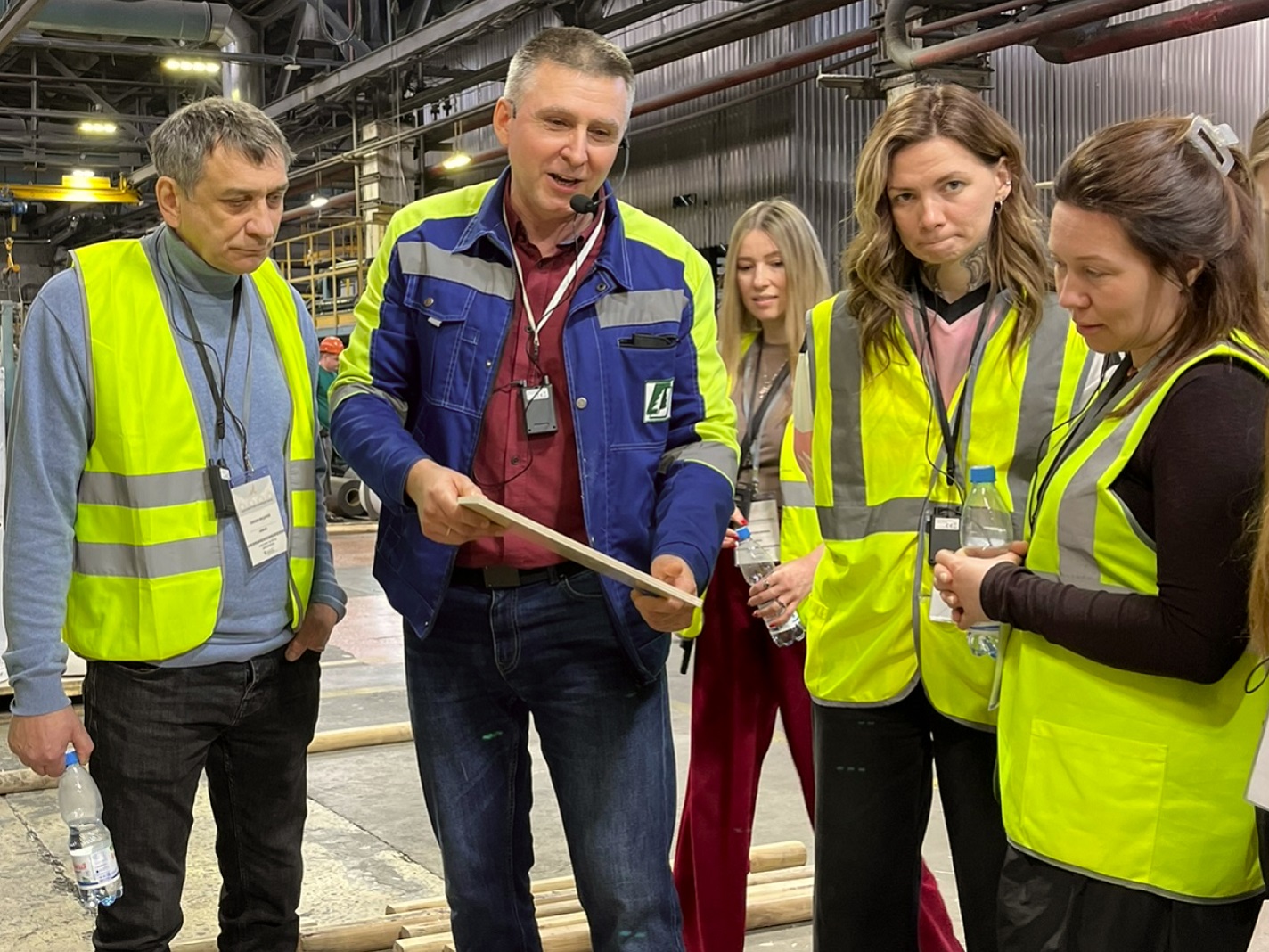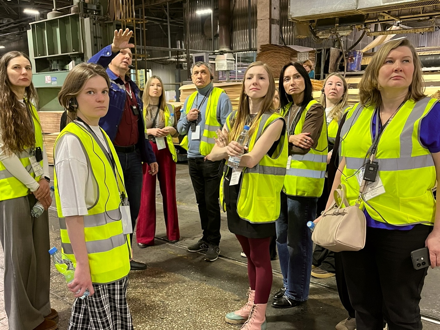 As part of the visit, the participants were given a detailed tour of the production workshops. The designers were able to see all the stages of creating plywood and chipboard, as well as get acquainted with the work of the laboratory where product quality control is carried out.