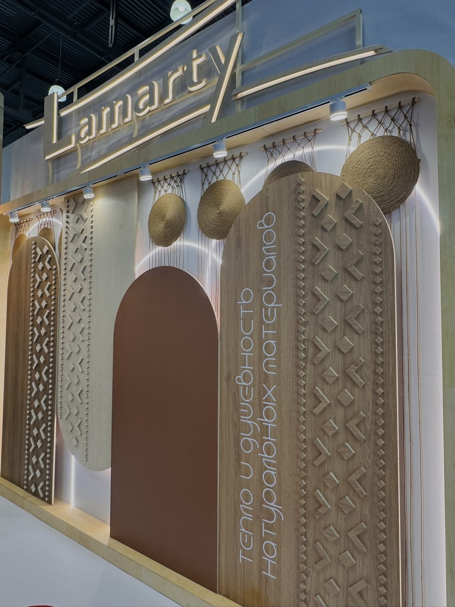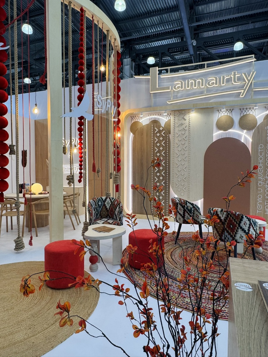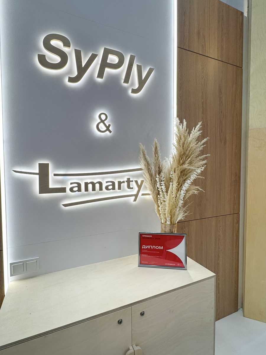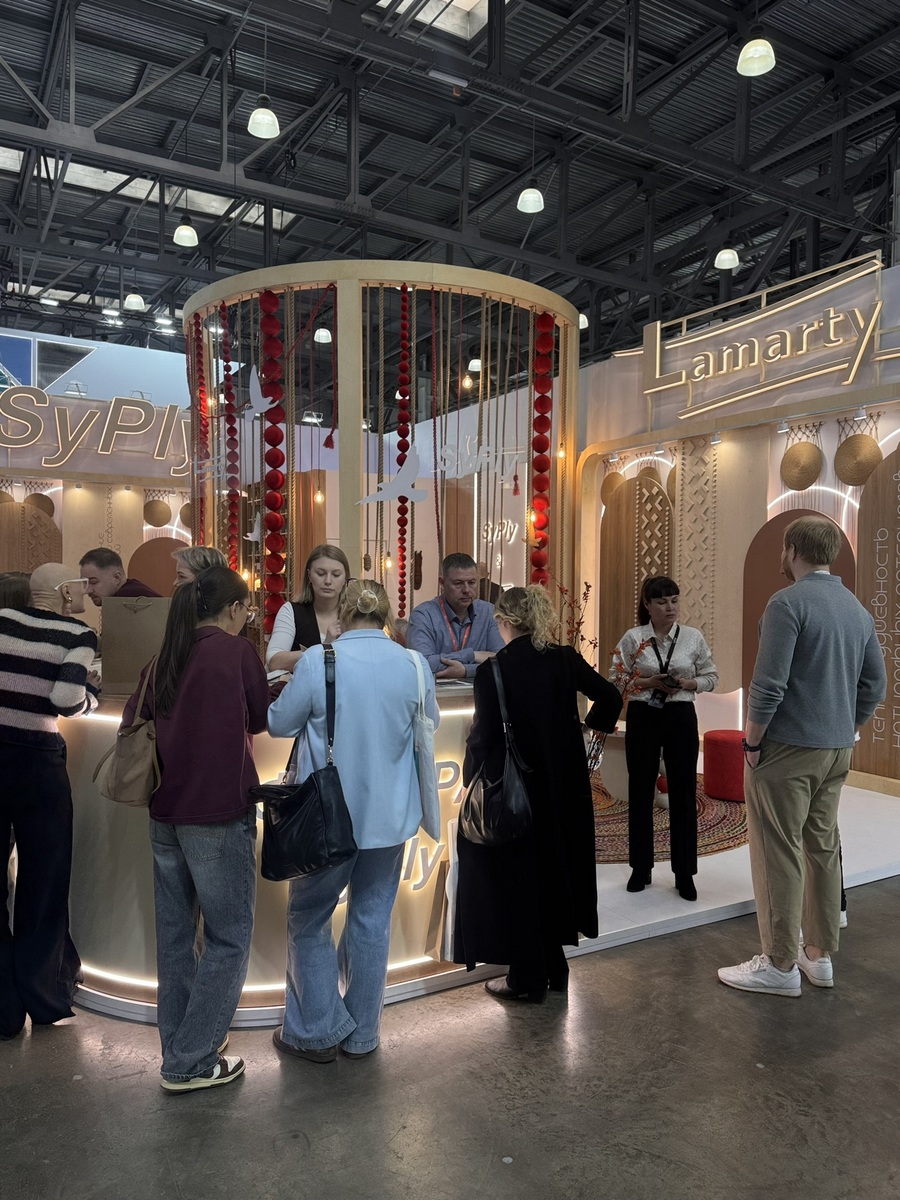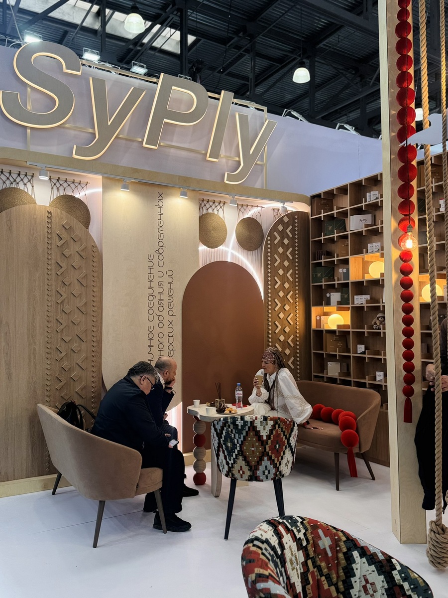 Сыктывкарский фанерный завод представил на выставке два ключевых бренда — SyPly и Lamarty. Концепция стенда была построена на идее переплетения материалов и решений: декоративные нити в оформлении символизировали взаимодействие разных типов материалов и их совместную работу в реальных проектах — от конструкционных задач до декоративных.