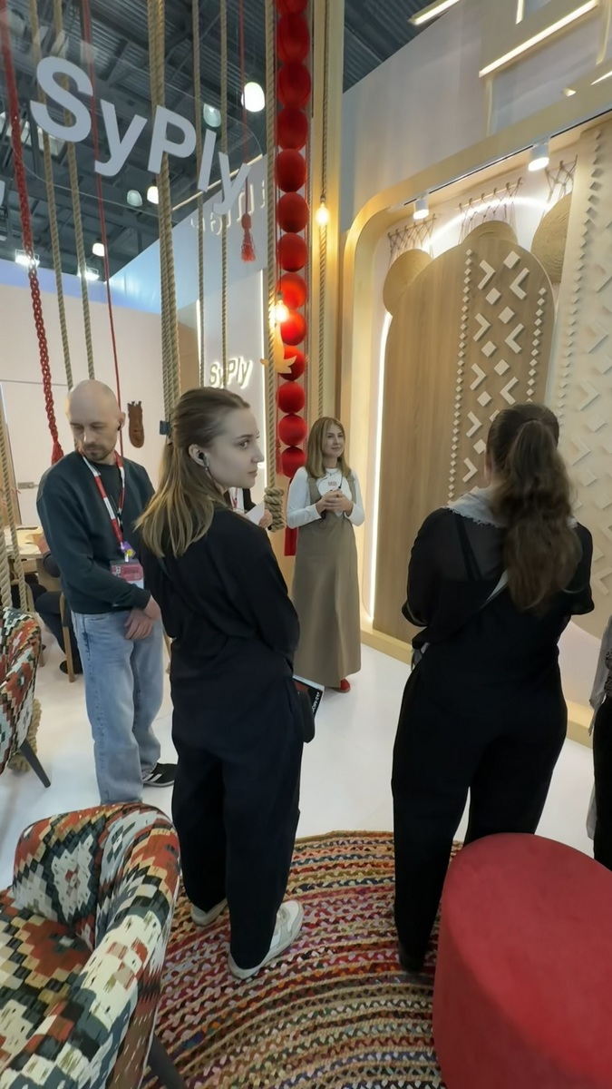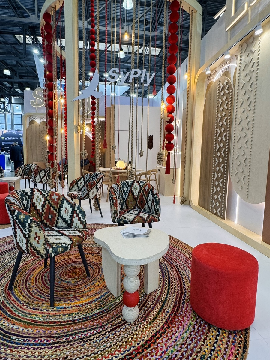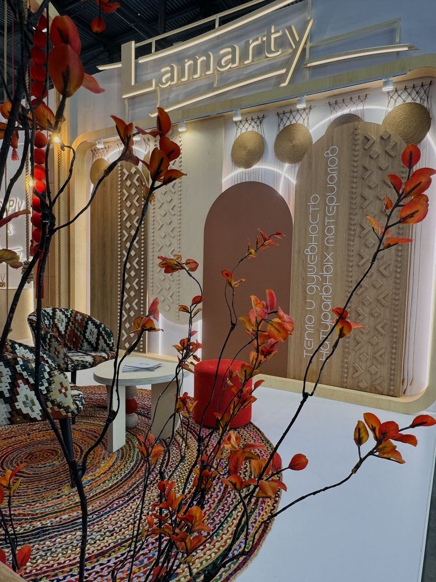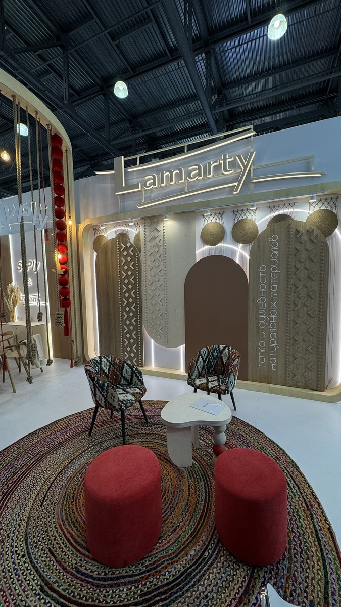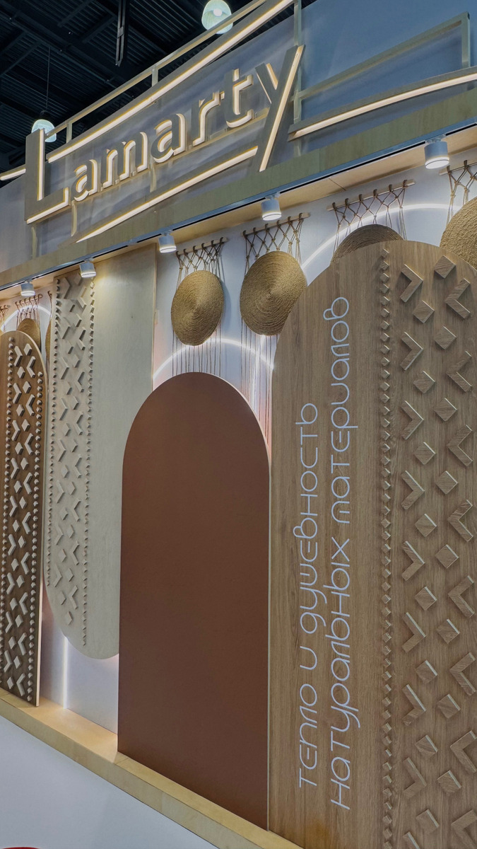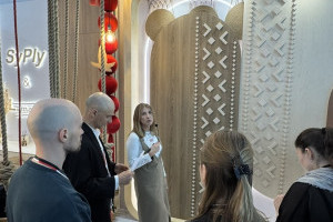 Сыктывкарский фанерный завод представил на выставке два ключевых бренда — SyPly и Lamarty. Концепция стенда была построена на идее переплетения материалов и решений: декоративные нити в оформлении символизировали взаимодействие разных типов материалов и их совместную работу в реальных проектах — от конструкционных задач до декоративных.