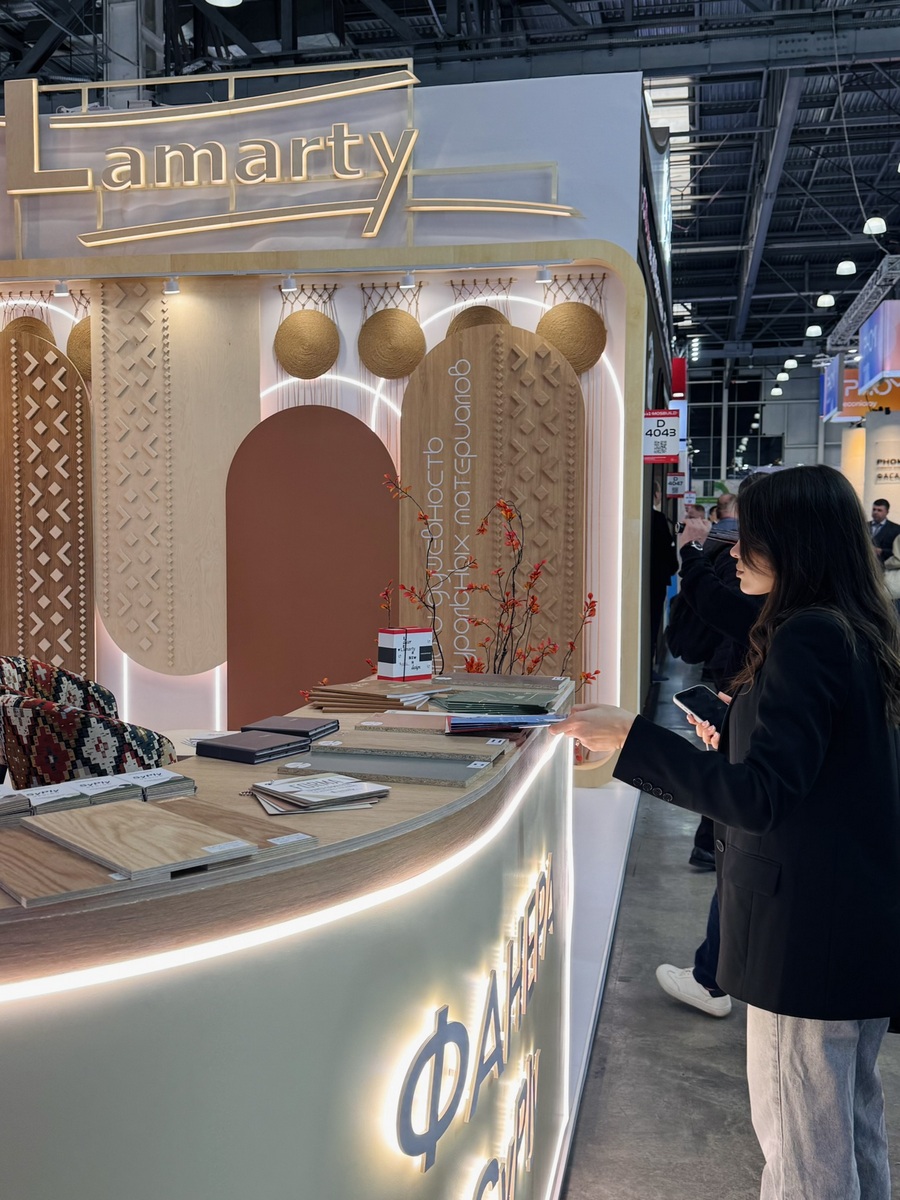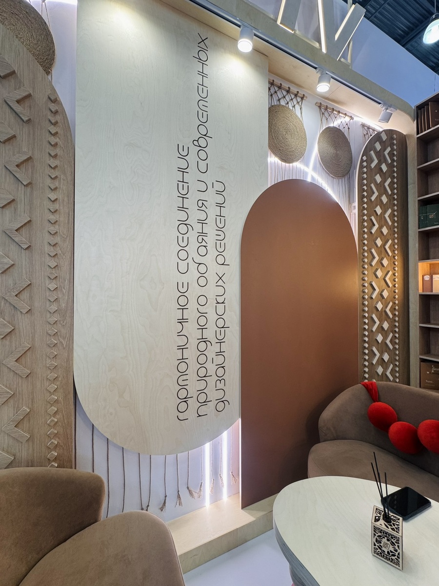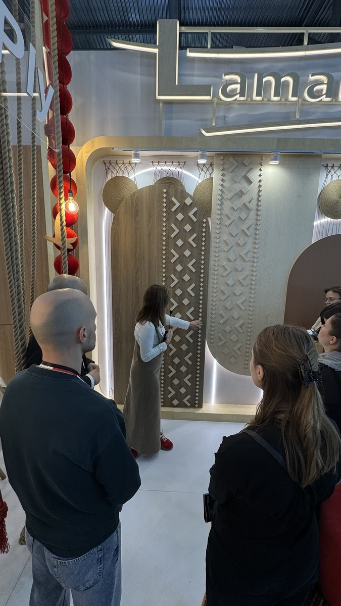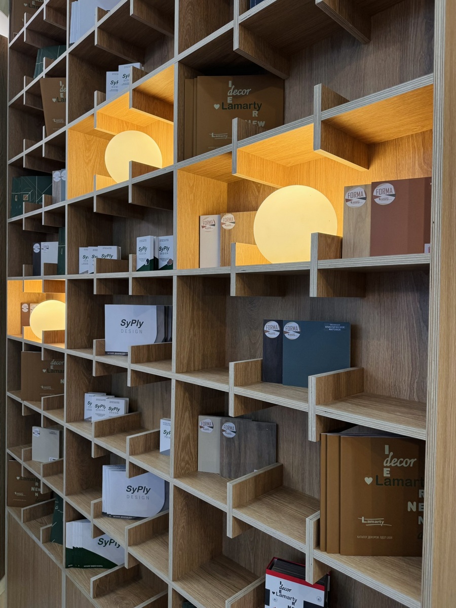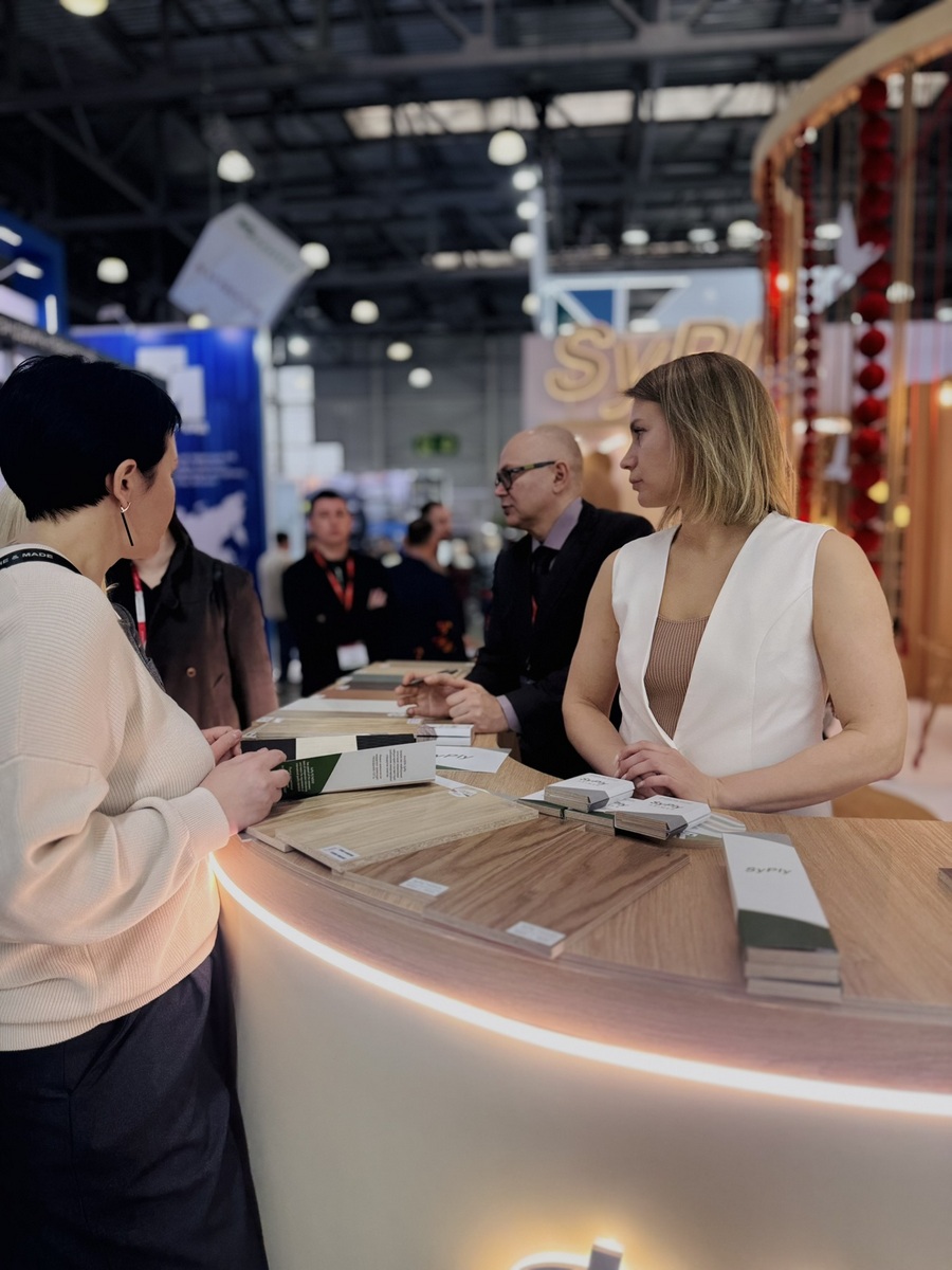 Мы продемонстрировали высокопрочную берёзовую фанеру SyPly, востребованную как в конструкционных задачах, так и в интерьерных решениях. Также представили декоры Lamarty для мебели, сделав акцент на коллекции FORMA — современных решениях, отражающих актуальные тренды дизайна.
