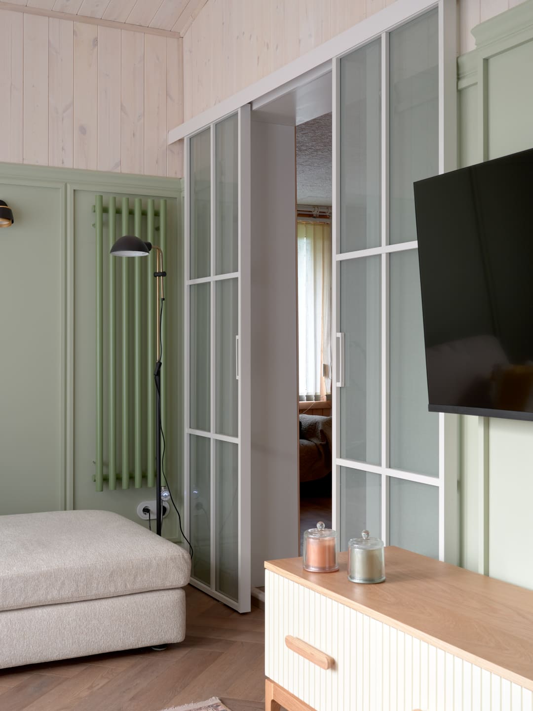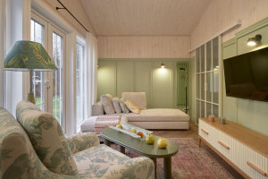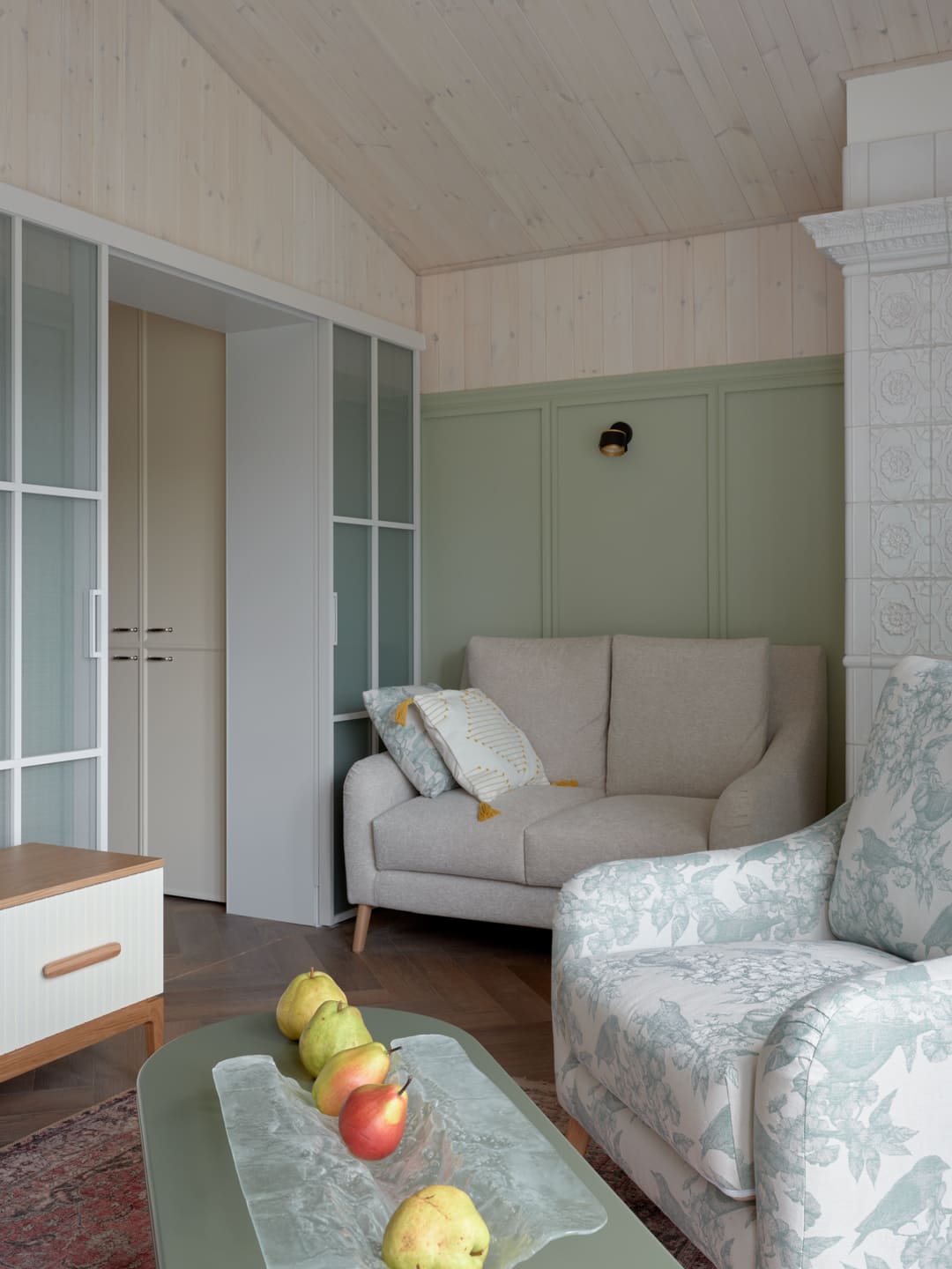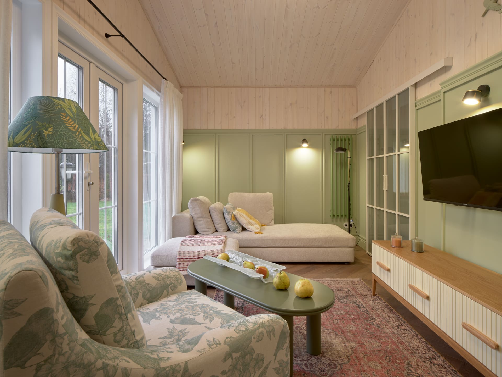 В интерьере задано мягкое, спокойное настроение, построенное на светлой палитре с природными оттенками. Цвета подобраны деликатно — без резких контрастов, с лёгким эффектом выгоревших на солнце поверхностей. Такое решение делает пространство визуально легче и создаёт ощущение уюта без перегруженности. За счет увеличенных оконных проемов и более открытой планировки в доме стало значительно больше естественного света, а вид на сад стал частью интерьера. Белая вагонка, окрашенные стены и аккуратные молдинги формируют нейтральную базу, которая подчеркивает архитектуру пространства и не отвлекает от деталей.