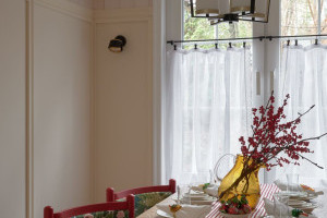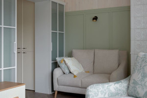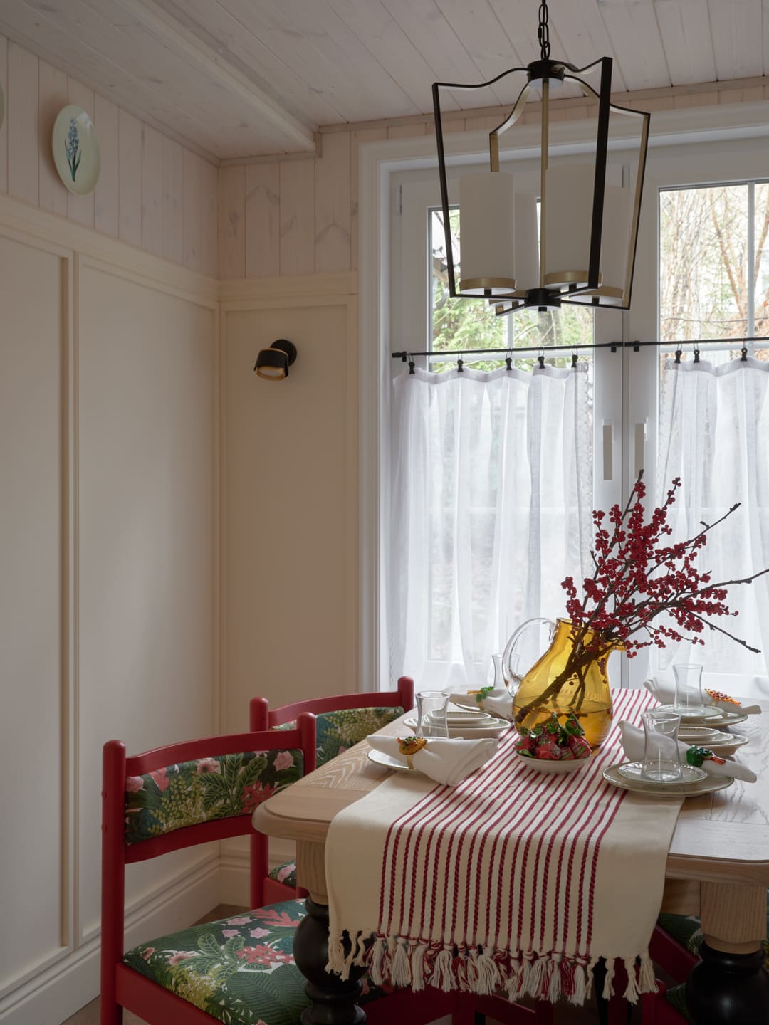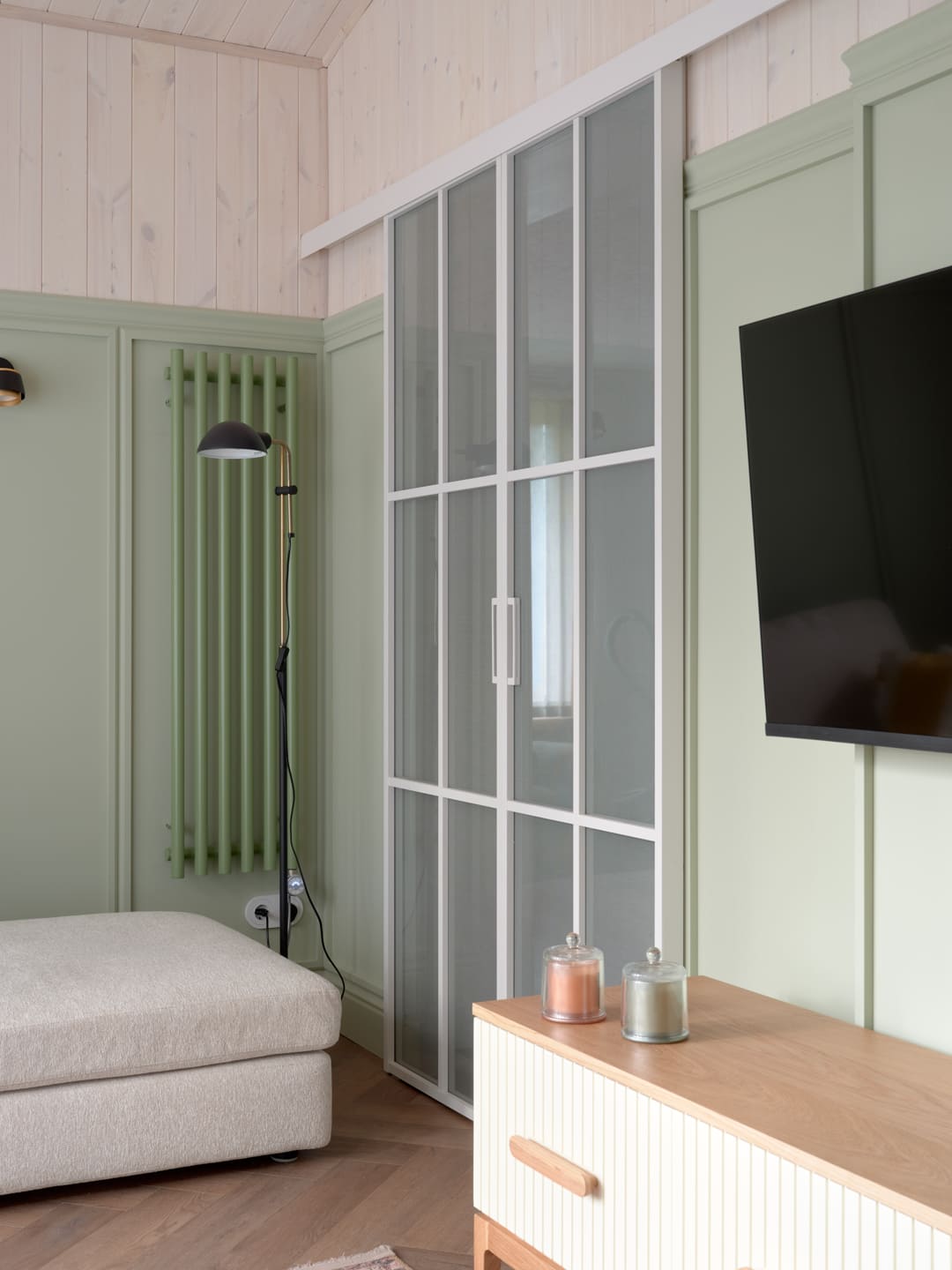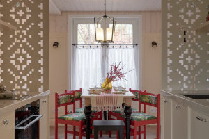 В интерьере задано мягкое, спокойное настроение, построенное на светлой палитре с природными оттенками. Цвета подобраны деликатно — без резких контрастов, с лёгким эффектом выгоревших на солнце поверхностей. Такое решение делает пространство визуально легче и создаёт ощущение уюта без перегруженности. За счет увеличенных оконных проемов и более открытой планировки в доме стало значительно больше естественного света, а вид на сад стал частью интерьера. Белая вагонка, окрашенные стены и аккуратные молдинги формируют нейтральную базу, которая подчеркивает архитектуру пространства и не отвлекает от деталей.