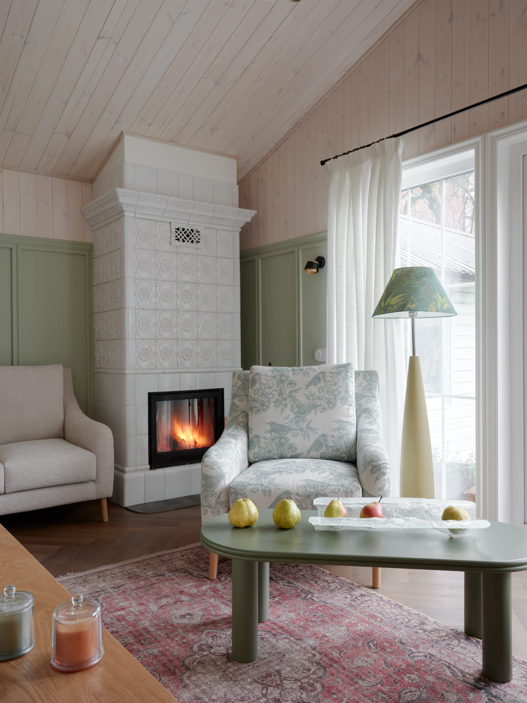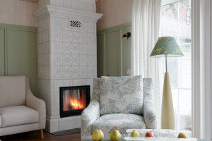 Центральным акцентом стал камин с чугунной топкой и панорамной стеклянной дверцей. Каминный короб облицевали изразцами и дополнили ажурными вентиляционными решетками, окрашенными в белый цвет — так он выглядит цельно и аккуратно вписывается в интерьер.