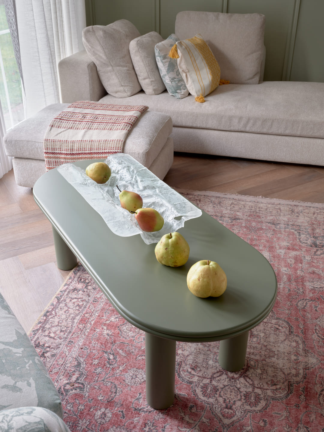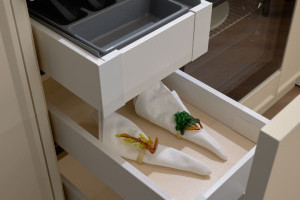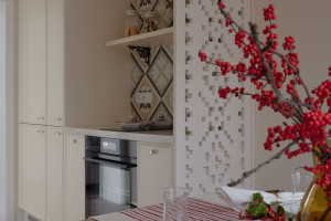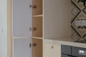 Кухня-гостиная решена как единое пространство, но с четкой функциональной структурой. Отказ от стандартной линейной схемы в кухне позволил сделать интерьер более свободным: мебель распределили по разным зонам, сохранив центр столовой комнаты открытым. Кухня выполнена по индивидуальному проекту, ее корпуса изготовлены из ЛДСП Lamarty в оттенке «Кремовый» — материал выступает надежной основой для всей конструкции, обеспечивая стабильность, долговечность и точную геометрию.