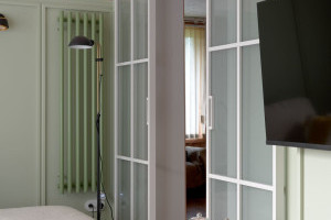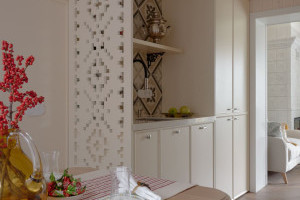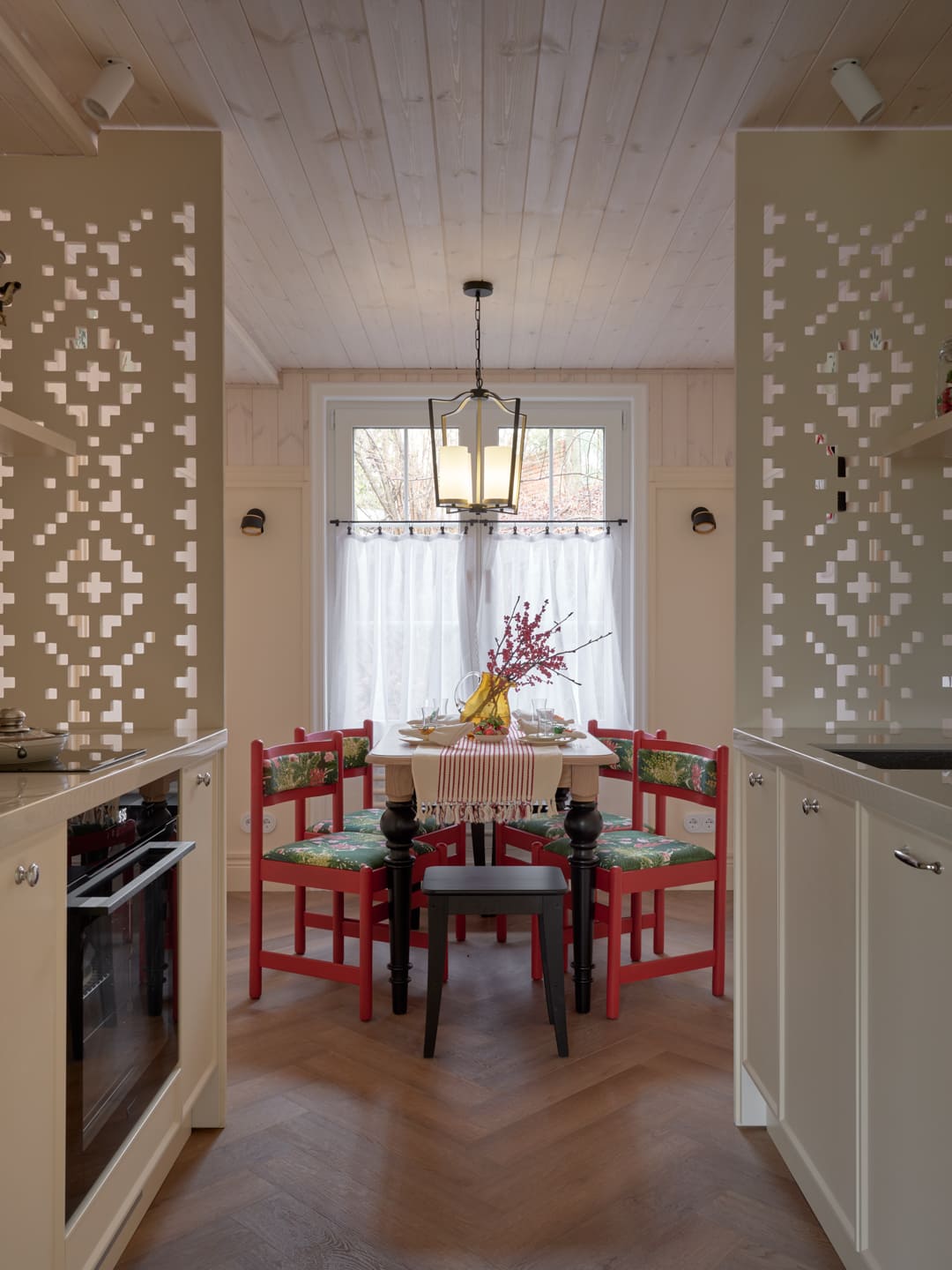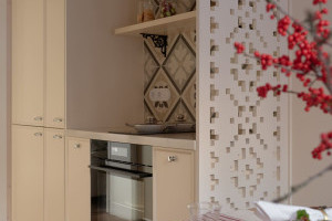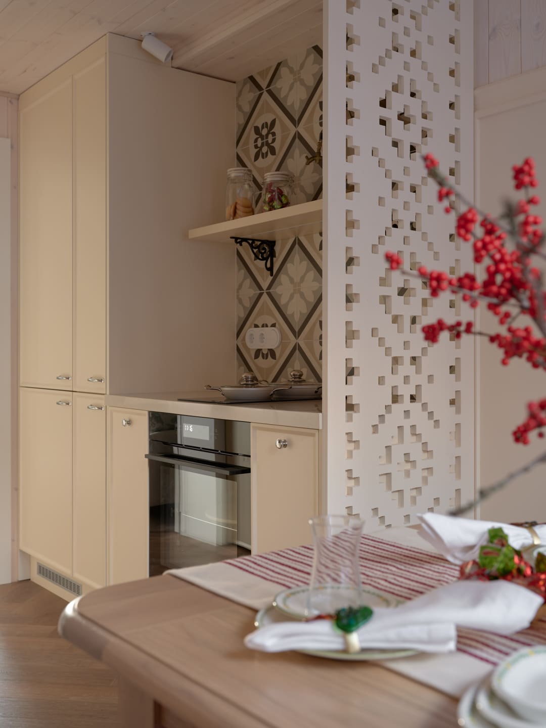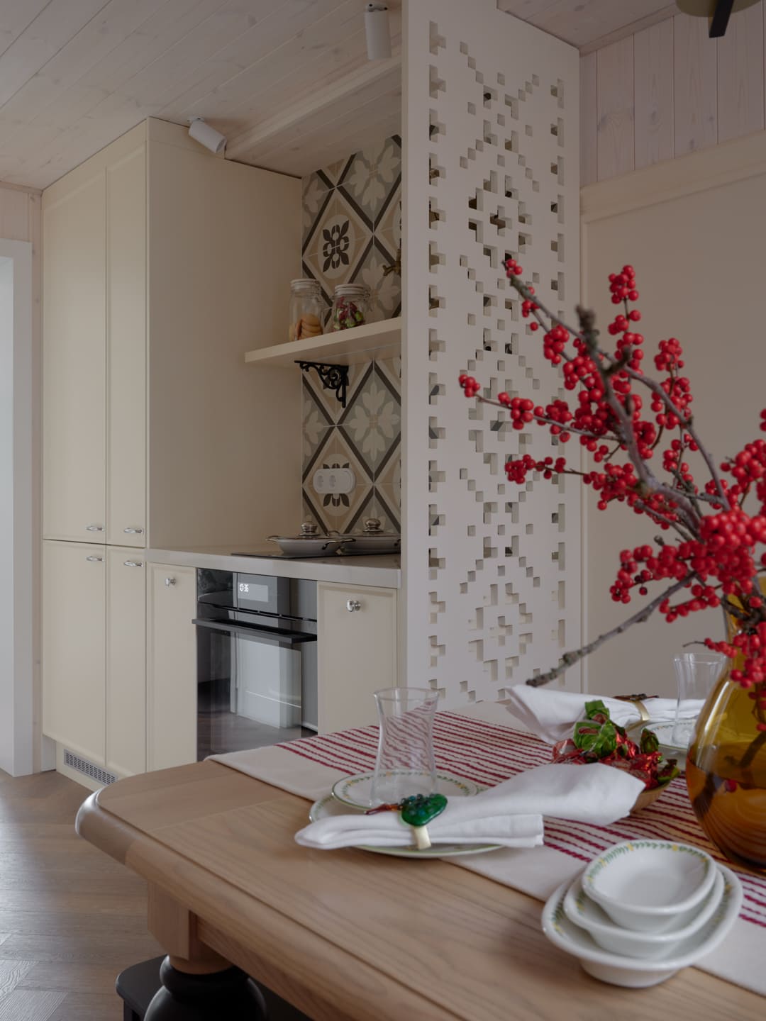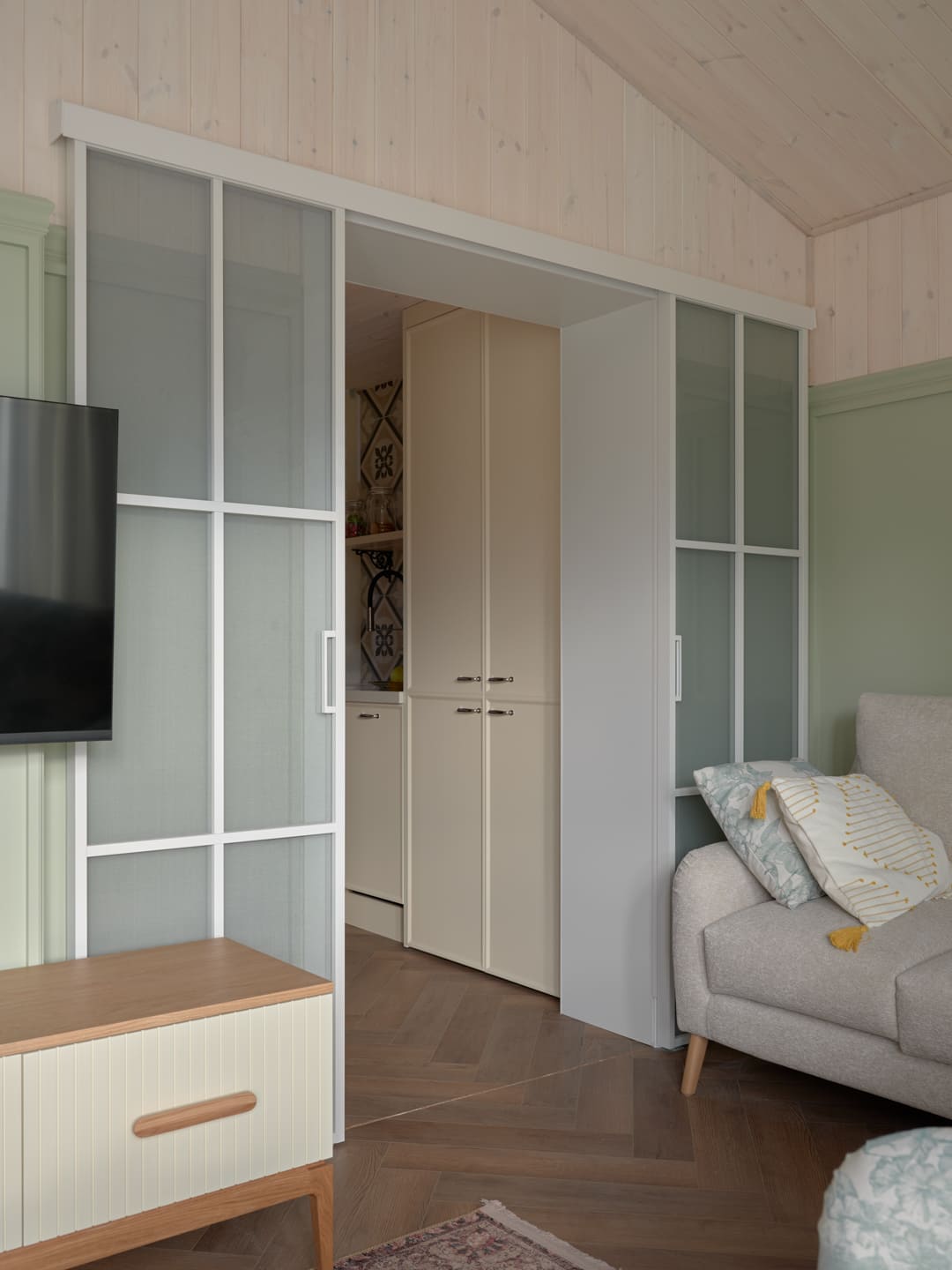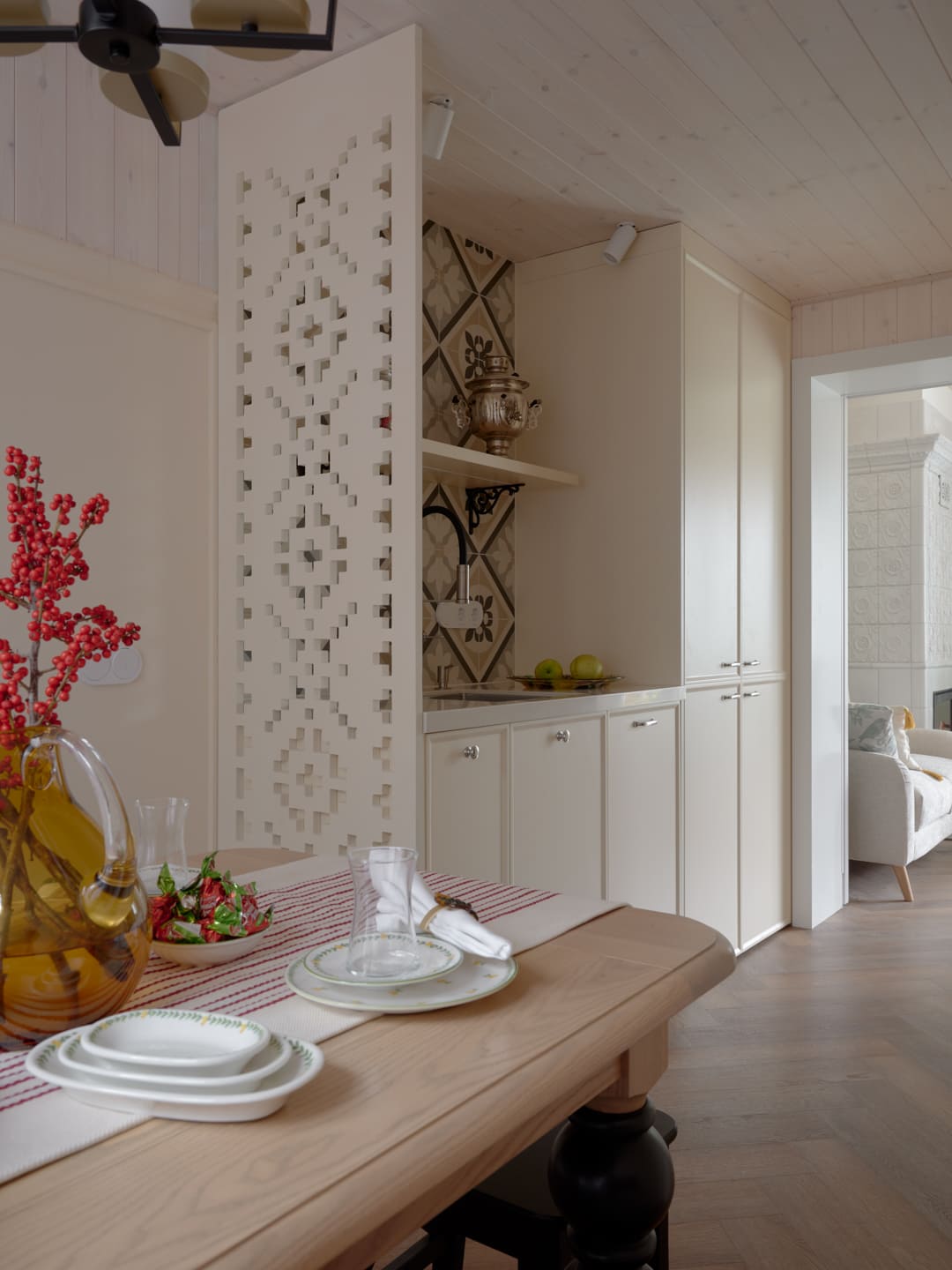 Зонирование решено деликатно: кухню и гостиную разделяет раздвижная перегородка, а обеденную зону — декоративные панели с фрезеровкой. Эти элементы позволяют при необходимости трансформировать пространство, не нарушая его целостности.