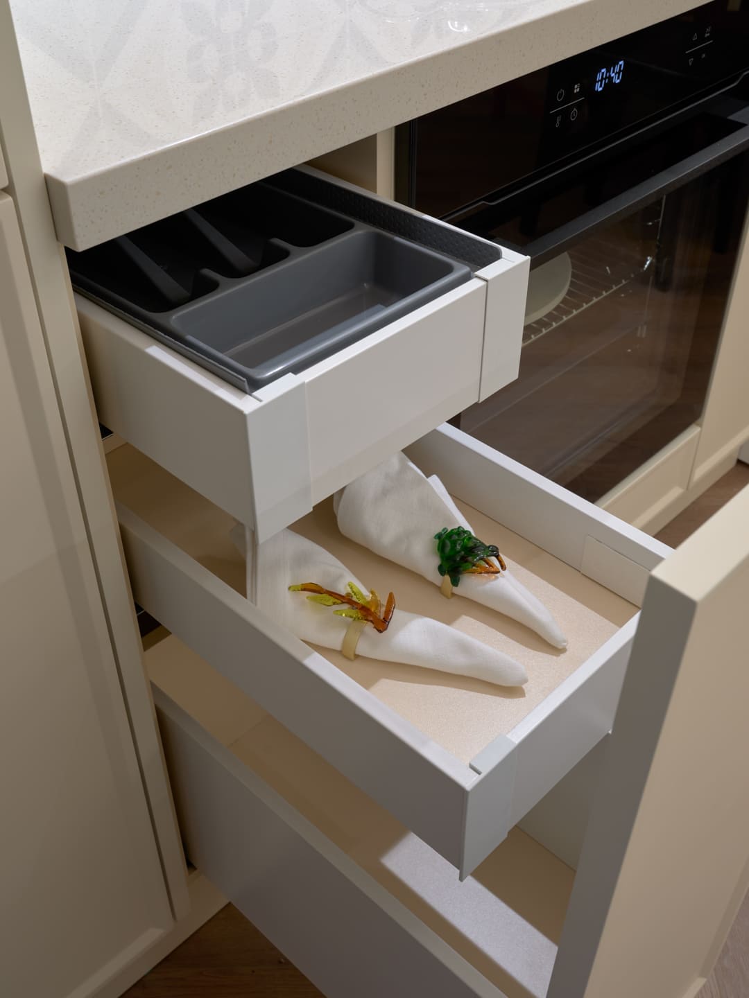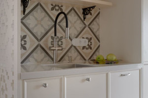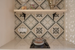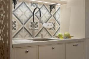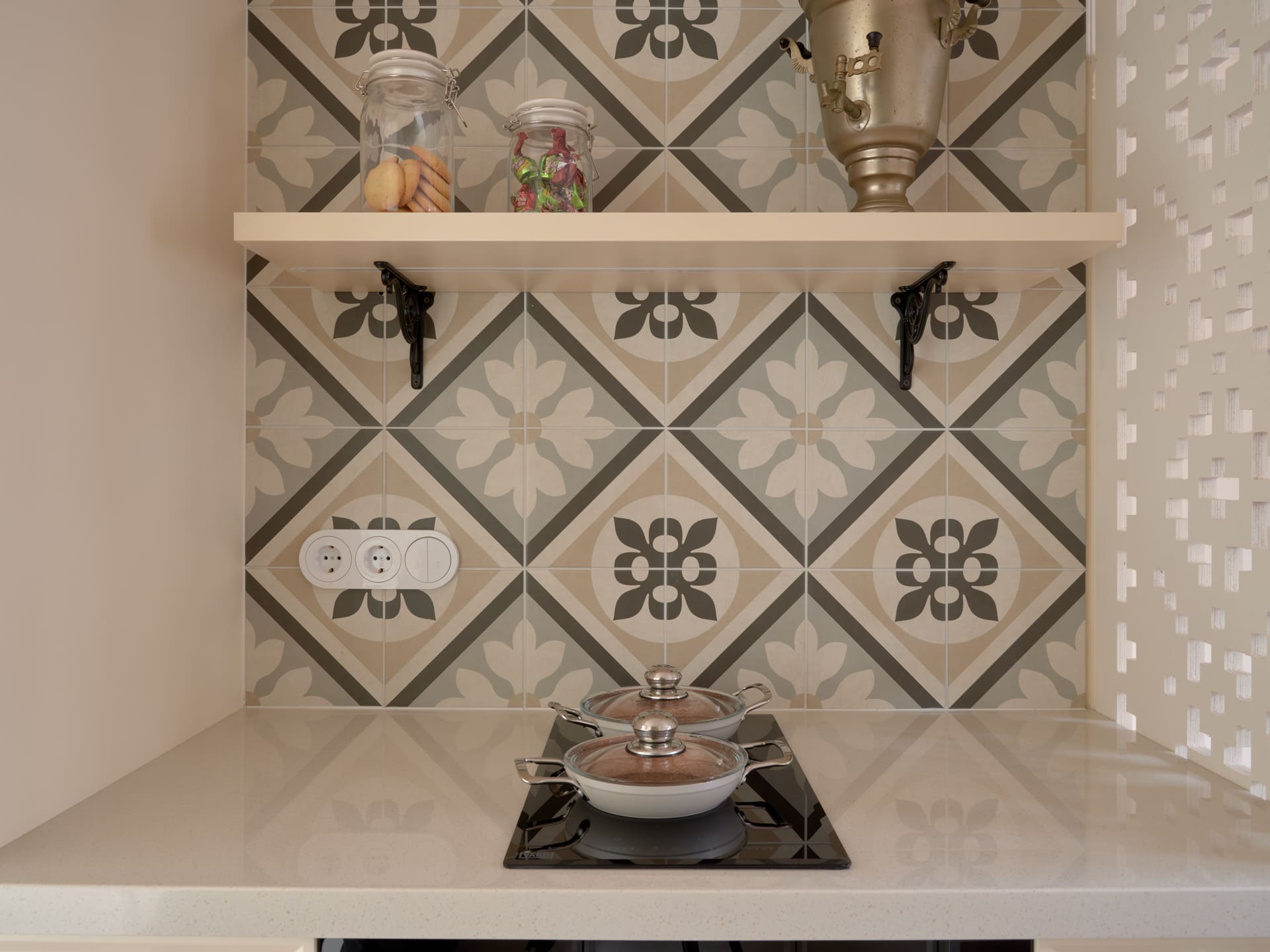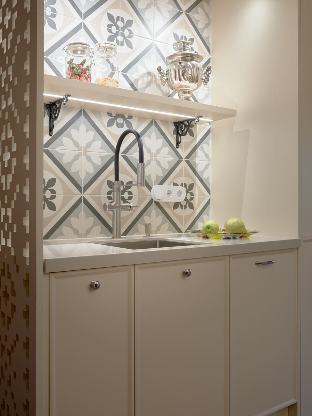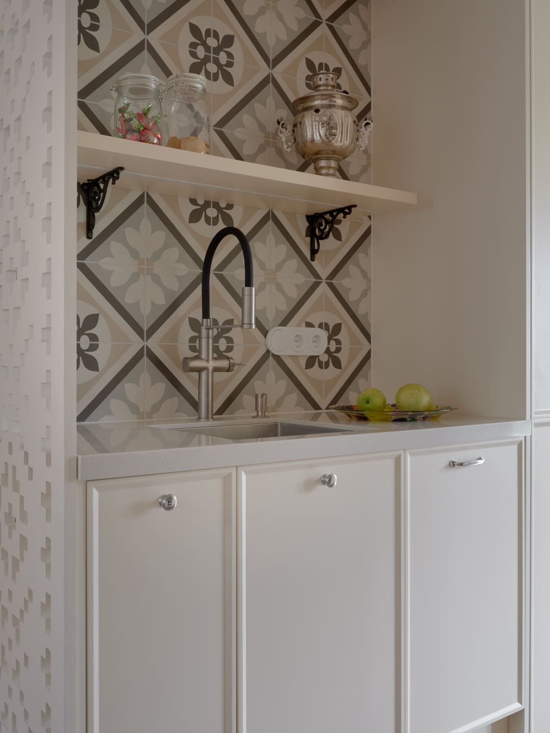 Фасады из МДФ в эмали с фрезеровкой формируют мягкую палитру, оставаясь в общей сдержанной стилистике. Фартук из керамогранита с цветочным рисунком поднимается до потолка, усиливая вертикали и добавляя декоративный акцент.