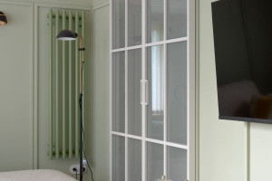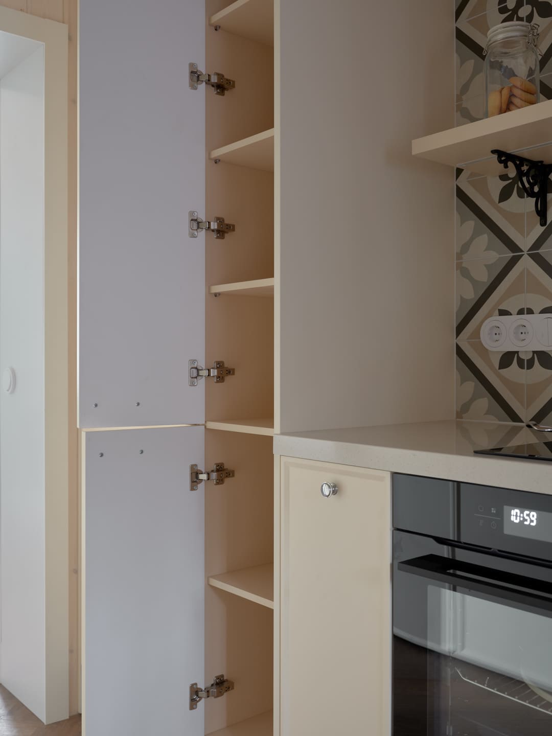 Одним из ключевых решений стали два высоких пенала у входа. Они не только организуют хранение, но и скрывают дверь в санузел, благодаря чему интерьер выглядит цельным и не перегруженным лишними деталями. Нижние модули с выдвижными ящиками и корзинами формируют удобную рабочую зону, а открытые полки на металлических кронштейнах добавляют легкости и используются для хранения повседневных вещей и декора.