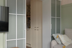 Проект наглядно показывает, как современные материалы помогают решать как практические, так и эстетические задачи. ЛДСП Lamarty здесь используется не только как конструктивная основа, но и как инструмент для создания аккуратных, продуманных встроенных решений — от систем хранения до скрытых дверей. Благодаря этому интерьер получается цельным, функциональным и удобным для повседневной жизни.
