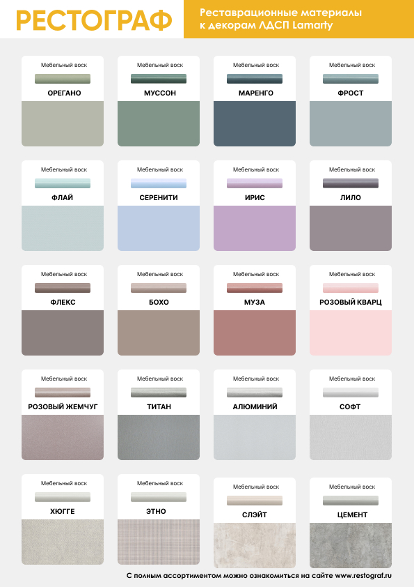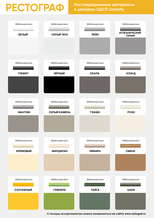 Реставрационные материалы «Рестограф» идеально подходят для восстановления мебели из ламинированной древесно-стружечной плиты Lamarty. Названия восков полностью соответствуют названиям декоров Lamarty, что упрощает процесс подбора.